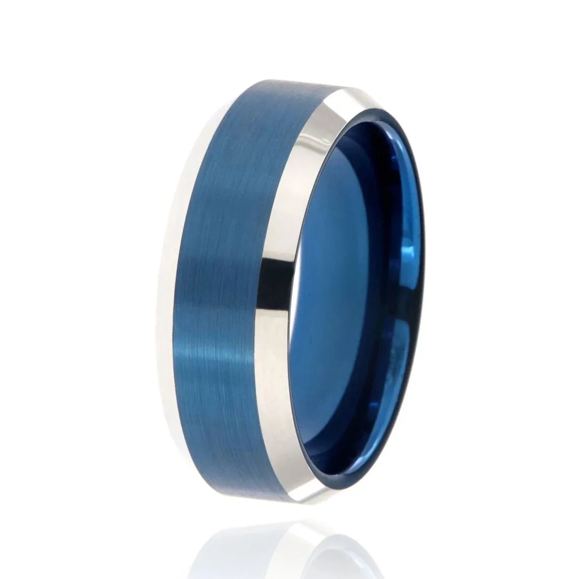 Presenting our exclusive 8mm , meticulously crafted in . Its high-polished silver beveled edges perfectly frame a captivating blue anodized brush finish, radiating modern elegance. Engineered for enduring comfort, the ring boasts a seamless comfort fit. This custom-made piece flawlessly merges strength with contemporary style, symbolizing unwavering commitment through its striking design—an impeccable choice for commemorating life's unforgettable moments with refined sophistication.