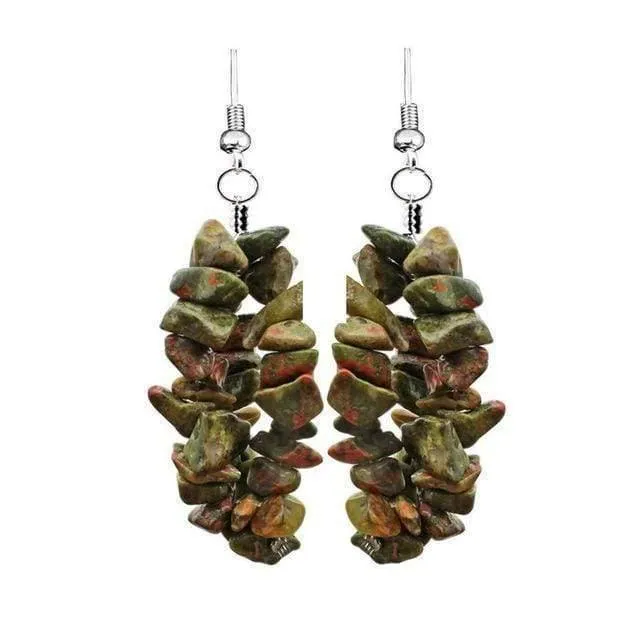Perfect with a matching bracelet, and elegant with every outfit under the sun. These ethnic, artsy and elaborate stone earrings are the perfect accessory day and evening. The combination of simple irregular shape and semi-precious stones are a nice juxtapostion.