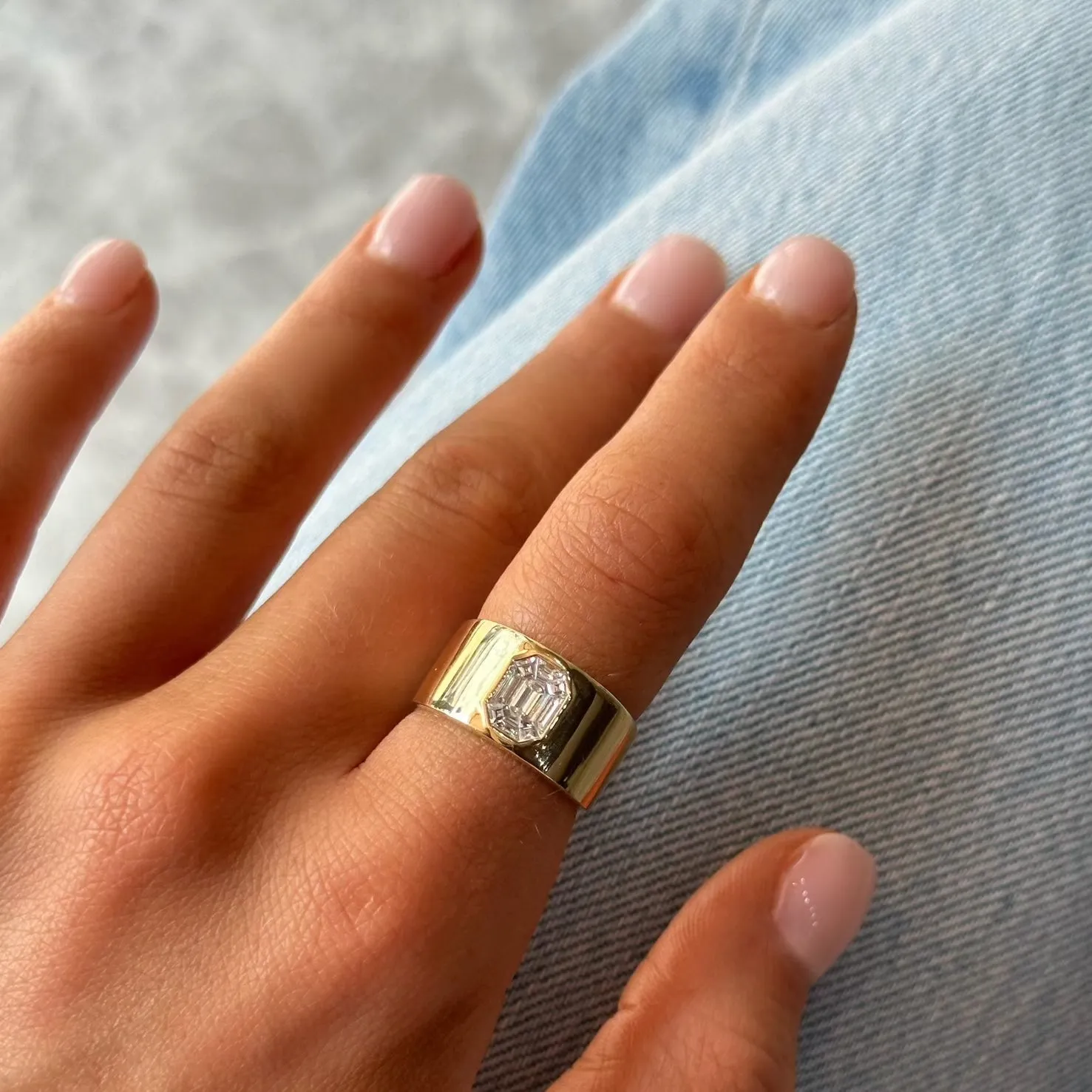 Discover the epitome of sophistication with our Baguette Diamond Gold Band. This exquisite ring showcases a series of radiant baguette-cut diamonds, each meticulously set in a sleek, polished gold band. The clean, geometric lines of the baguette diamonds create a striking contrast against the warm, lustrous gold, highlighting their dazzling brilliance and unique sparkle. Perfectly capturing the essence of modern elegance, this band is designed to make a bold statement while offering timeless appeal. Whether as a standalone piece or paired with other fine jewelry, it adds a touch of refined glamour to any occasion.
