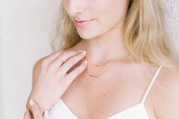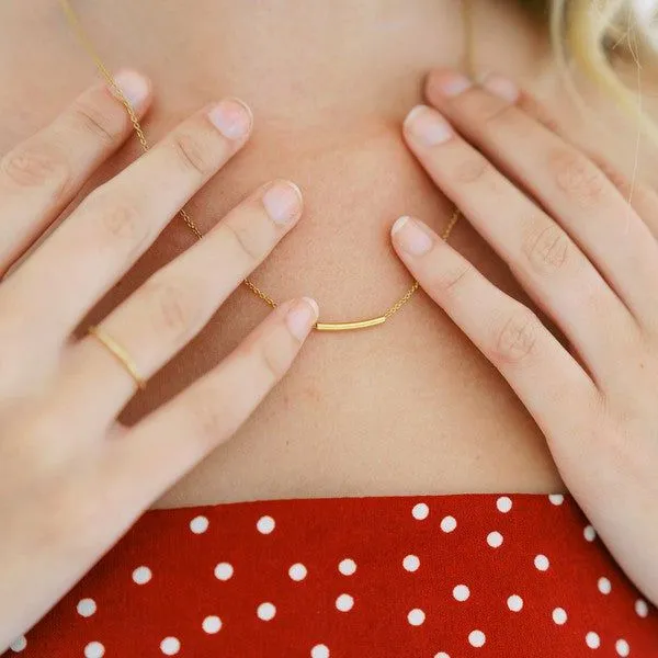 A slender curved bar strung on a thin chain. A classic necklace silhouette.