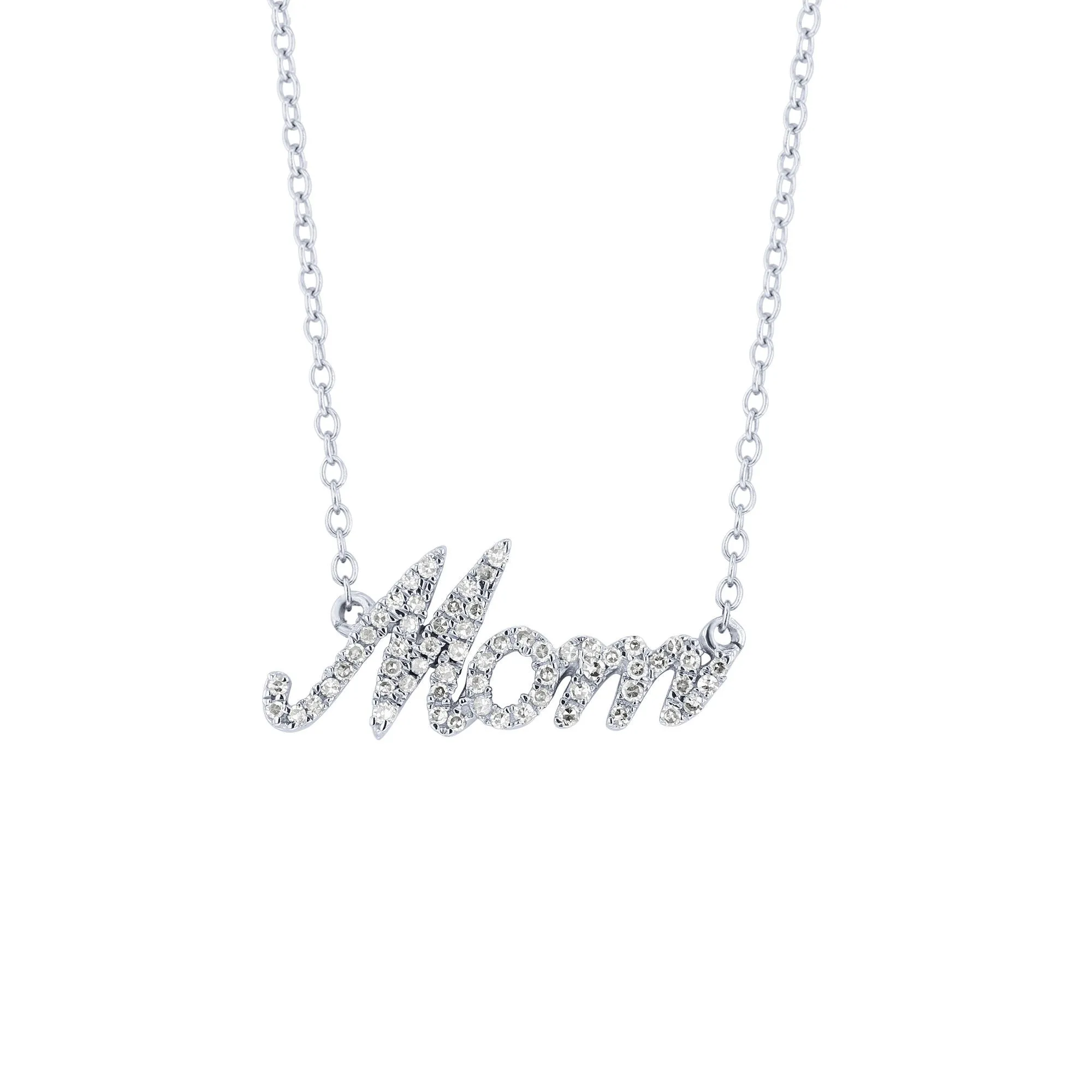 Give your Mom a gift that she can wear daily! Round brilliant diamonds are pave set into a 'Mom' script silhouette that is the perfect concoction of classic and glamour.