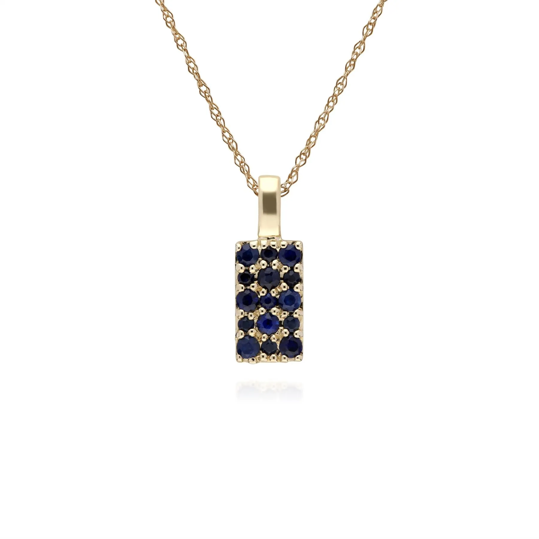 15 dazzling sapphires pave set onto a simple 9ct yellow gold panel. This pendant comes with a matching 9ct yellow gold 45cm / 18inch chain. Alternative chains are available on request.