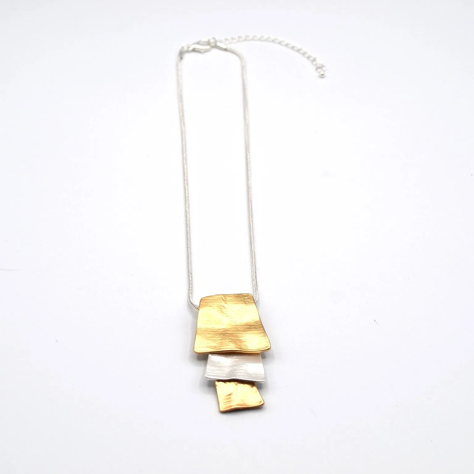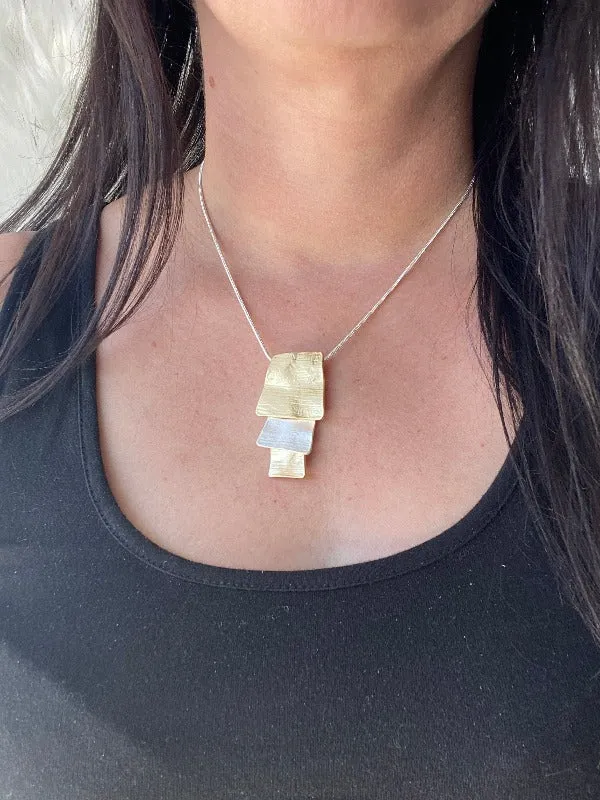 This pendant is inspired from the archaic-geometric period of ancient Greece. Known for it’s simple lines and abstract forms, this necklace features three hammered square pendants suspended on a 14-inch chain.