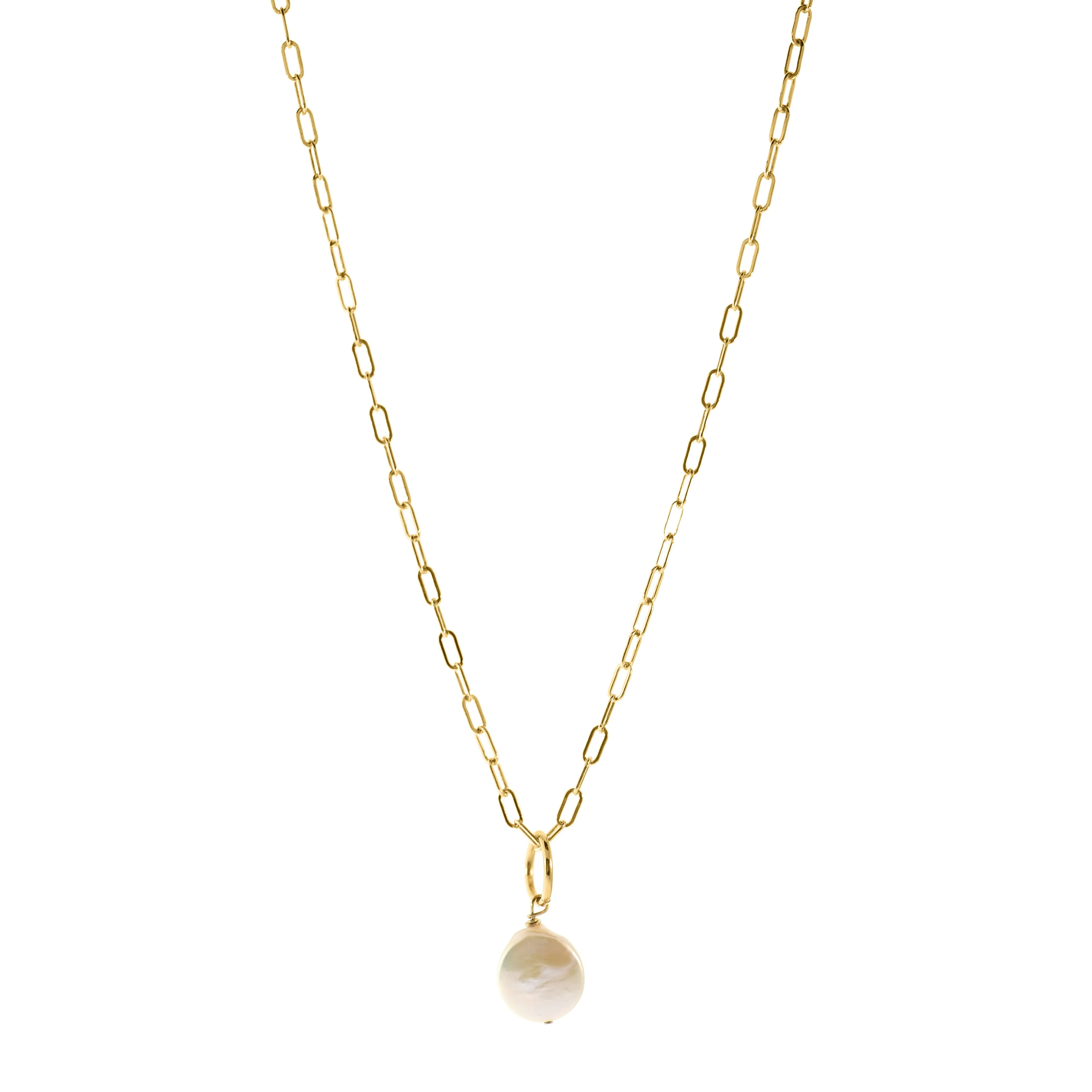 Tap into minimal elegance with our Esther necklace. A freshwater, coin pearl is suspended from our 14kt gold-filled, small golden links chain. Easy to wear and layer. Handcrafted / Made in USA. Measures 18"-20".