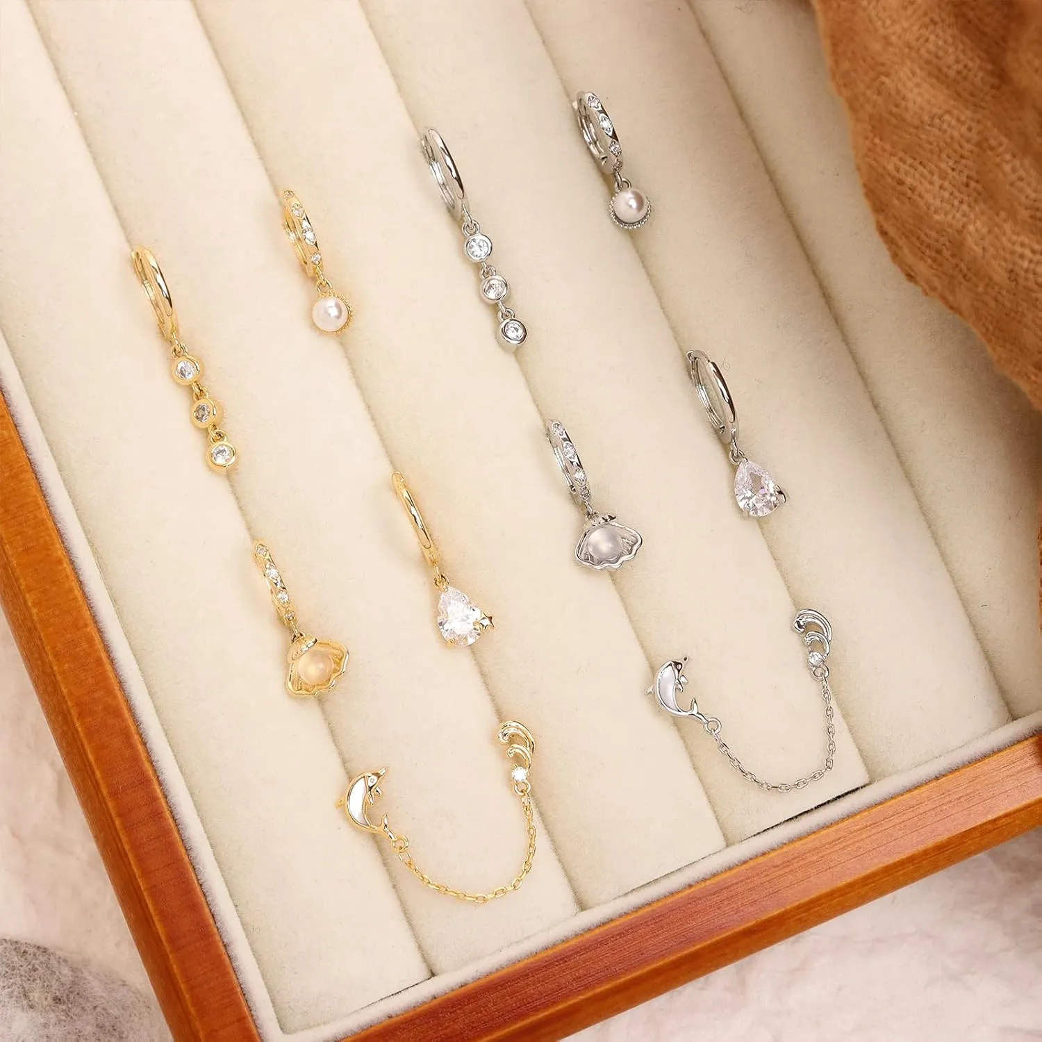 - Dainty silver hoop and stud earrings set, including 1 pair stud and 2 pairs dangle huggie hoop earrings, adored with rhinestone teardrop, shell, pearl, chain, ocean wave and moonstone-studded dolphin ornaments.