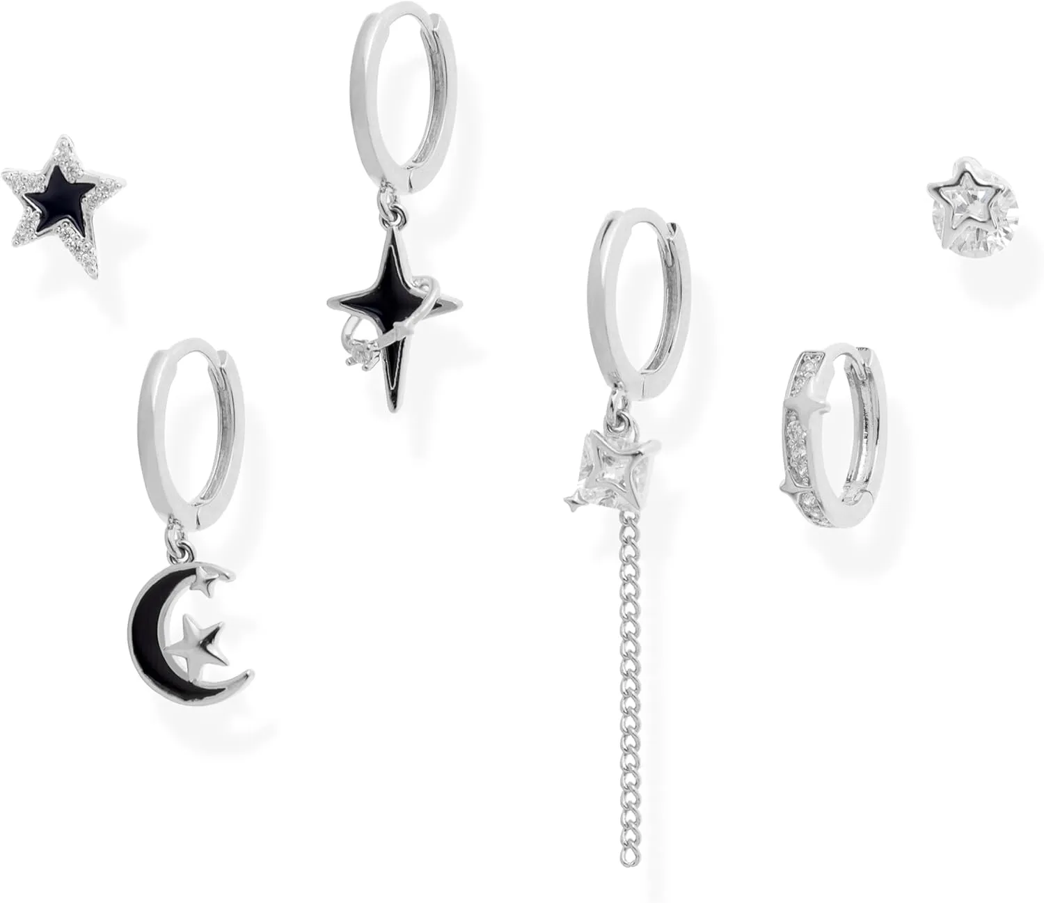 - Dainty silver hoop and stud earrings set, including 1 pair stud and 2 pairs dangle huggie hoop earrings, adored with rhinestone and enamel star, moon, planet and tassels.