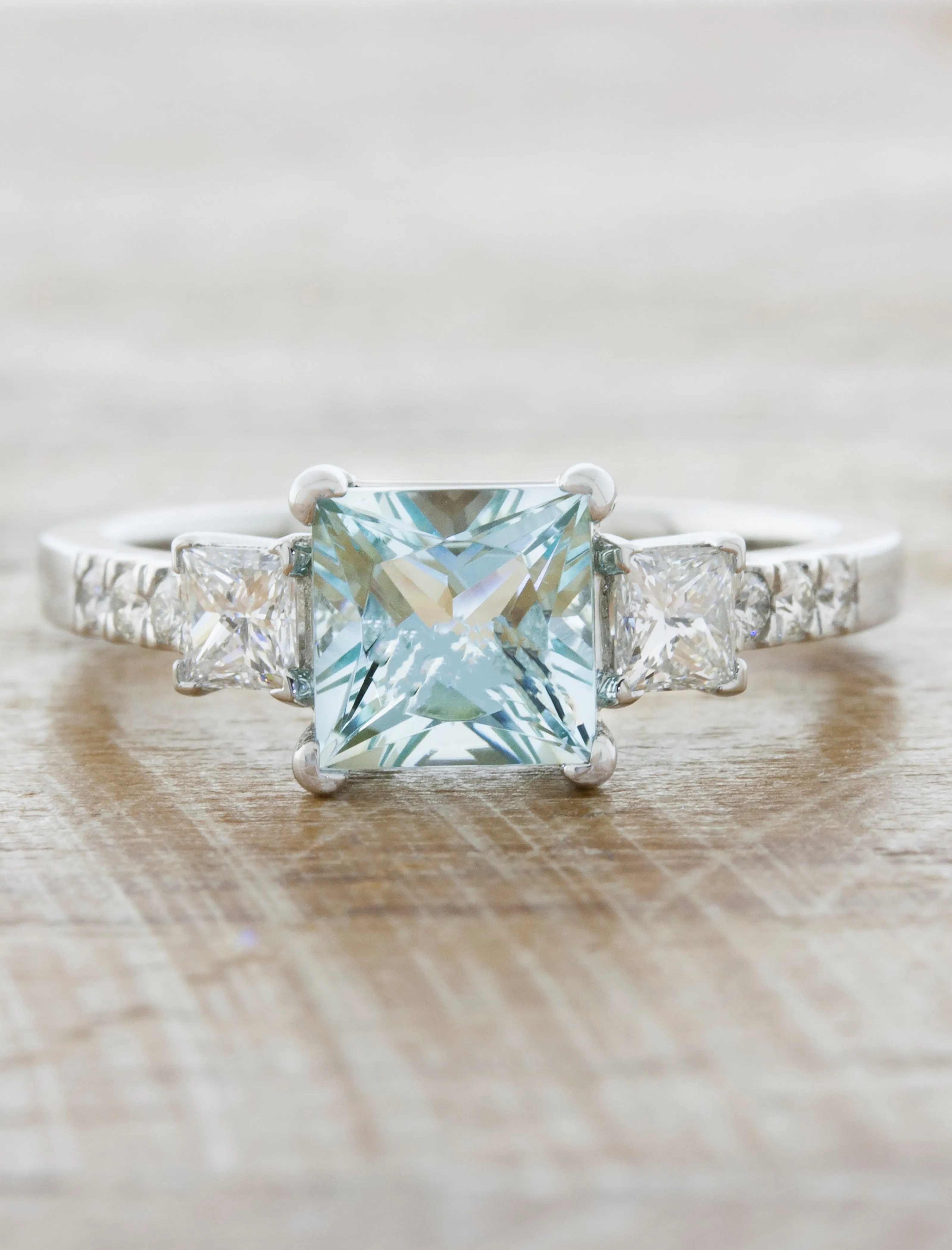 Our client used the words - classic, refined and elegant. Heatherette is our answer. Her center is a nicely, square shaped princess cut that is flanked by two equally beautiful side diamonds. Like the crown of a queen - she reigns our hearts.