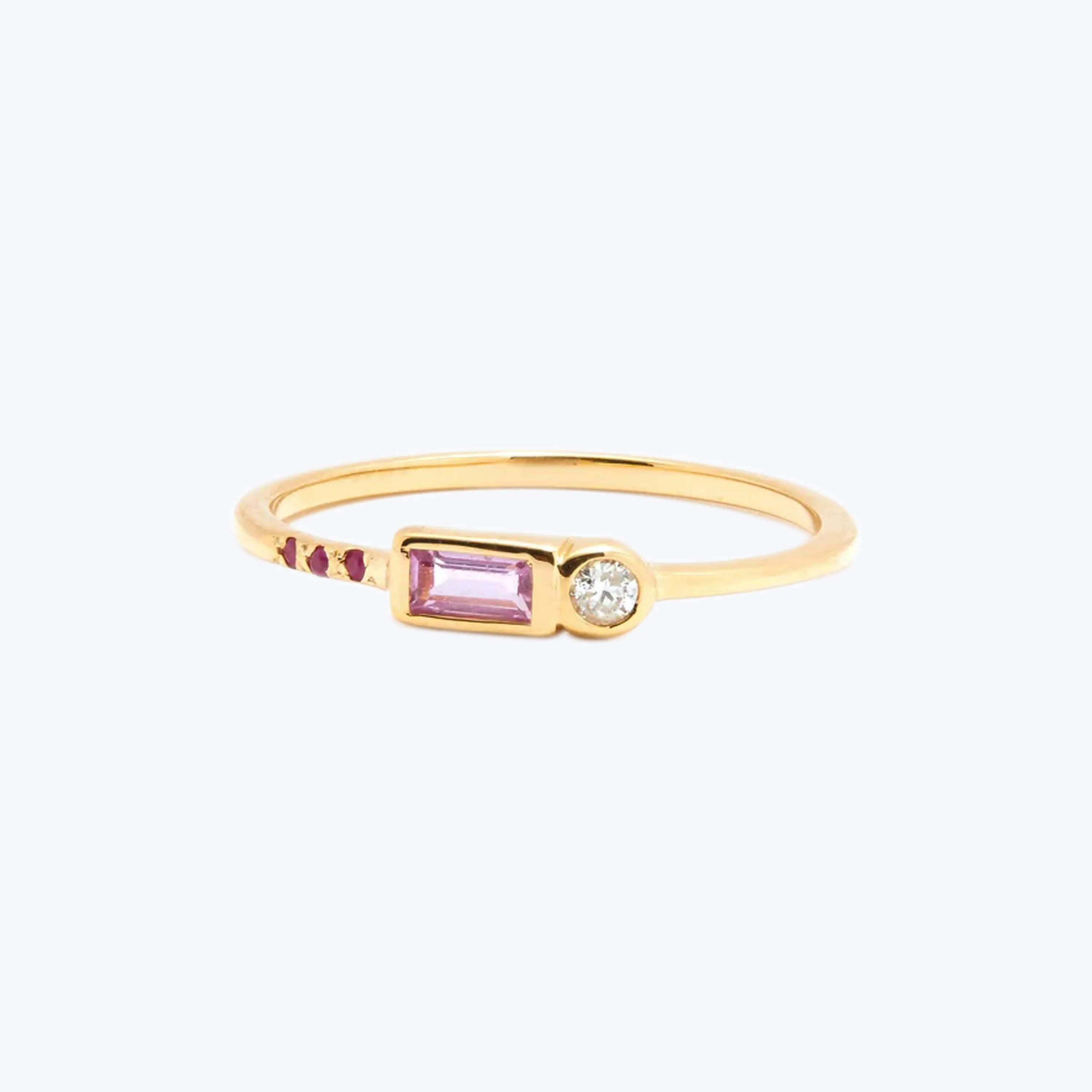 Inspired by the open air markets of the world, the Mercado Stack Ring in Pink Sapphire is cast from solid yellow gold set with a bright Pink Sapphire baguette center, accented by a bezel set Diamond and pave band of hot pink Rubies.