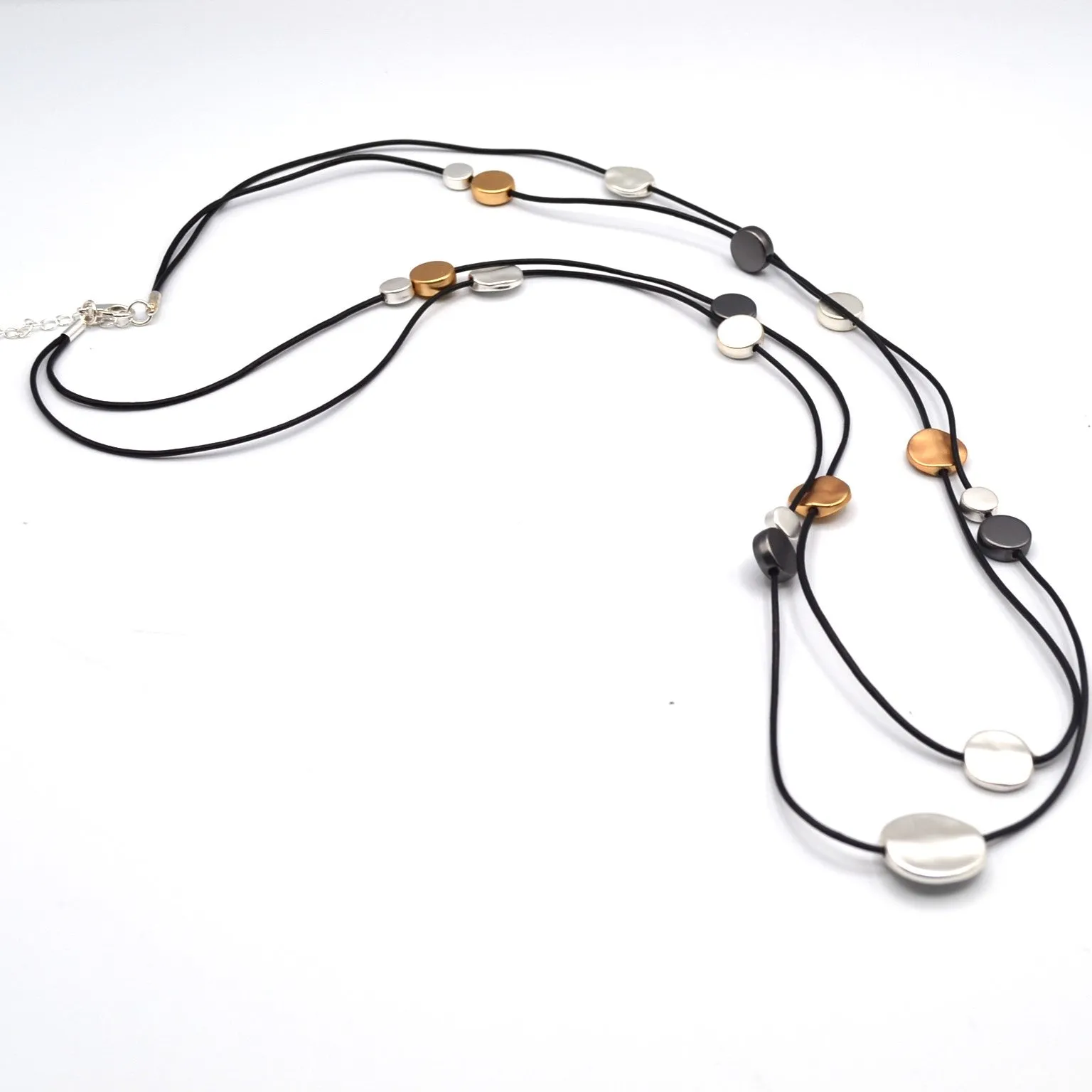 Add some modern boho chic to your style with this beautiful necklace. This piece features a double strand rope necklace with circle pendants that shine and reflect light marvelously.