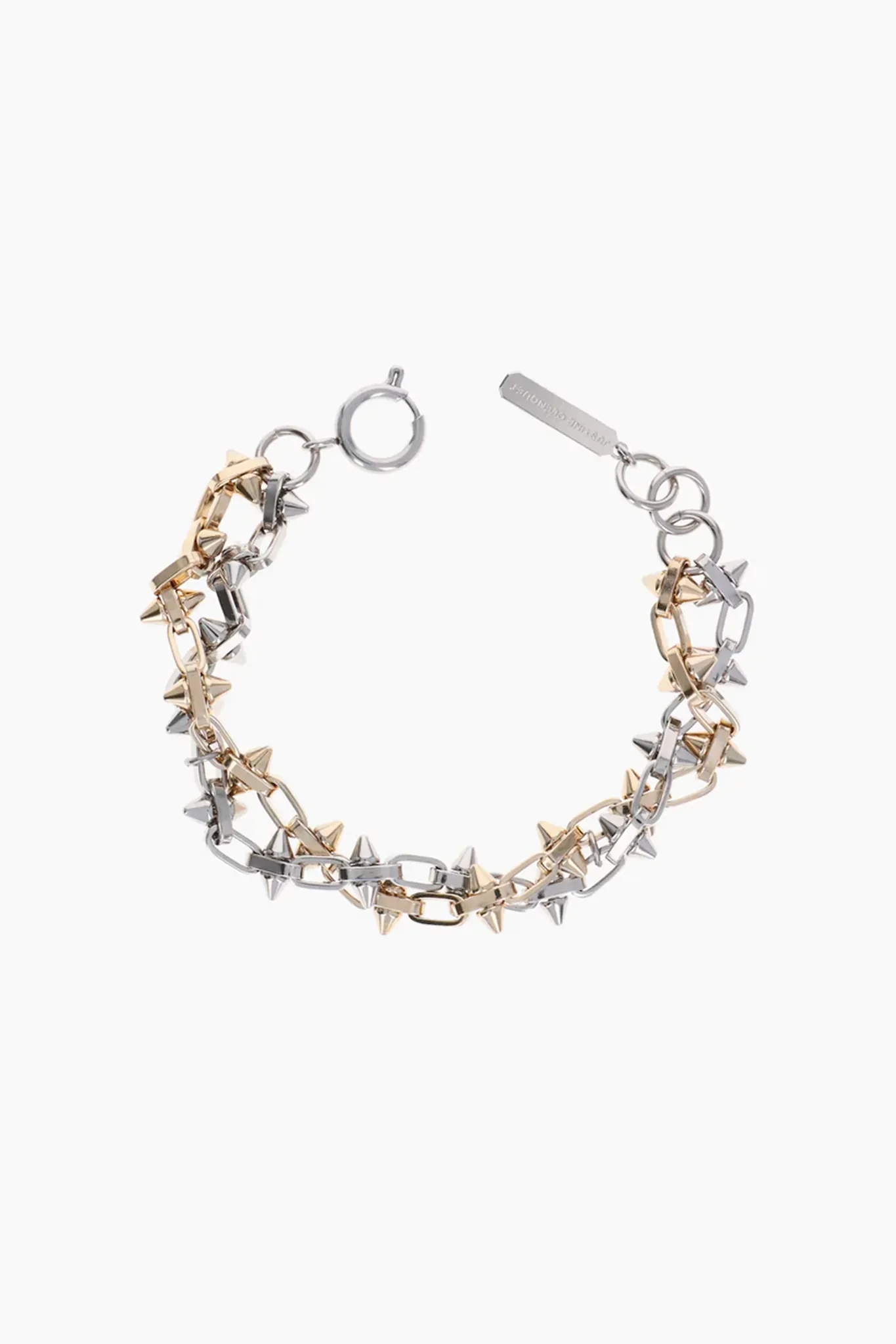 Silver-tone and pale gold spike chain-tiered bracelet. Signature layered design. Spiked detailing throughout. Spring-ring clasp with logo charm.