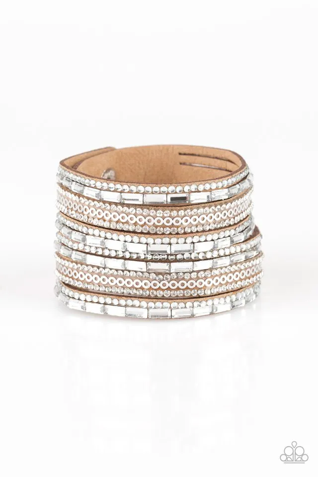 Spliced into numerous strands, a thick brown suede band is encrusted in row after row of glassy white rhinestones and flat silver accents for a sassy look. Features an adjustable snap closure. Elevate your style with this stunning Paparazzi Bracelet! Check out our for more trendy accessories.