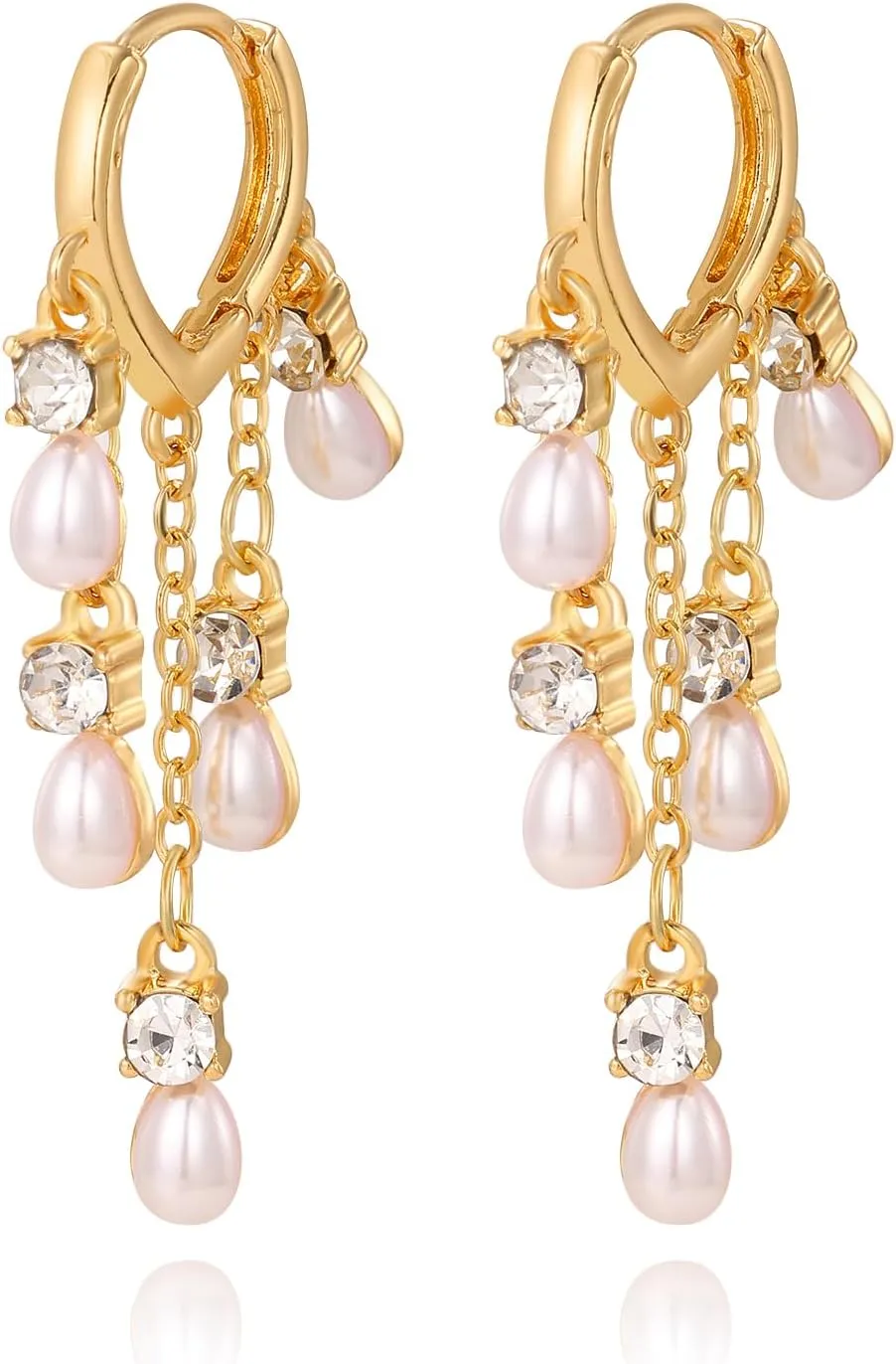 - ELEGANT DESIGN: Gold-plated hoop earrings featuring cascading pearl drops and sparkling rhinestone crystals in a sophisticated multi-strand arrangement