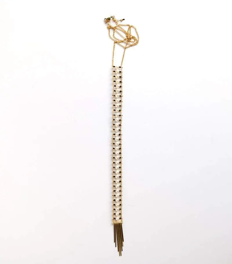 Materials: Gold-filled chain, Pearl beads, Spinel beads and brass tassels.