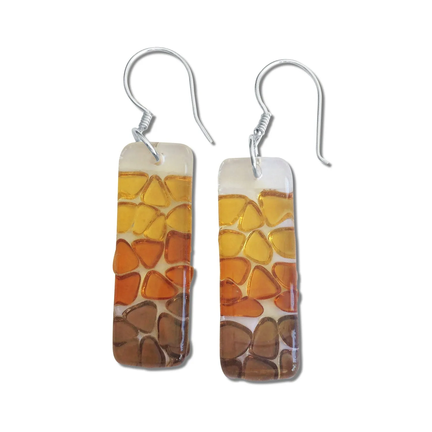 These Earrings are made by using colorful, triangle-like pieces of glass against a Clear Sheet of Glass. Then, they go into the oven at high temperatures so that the colorful and clear glass fuse together, achieving this look.