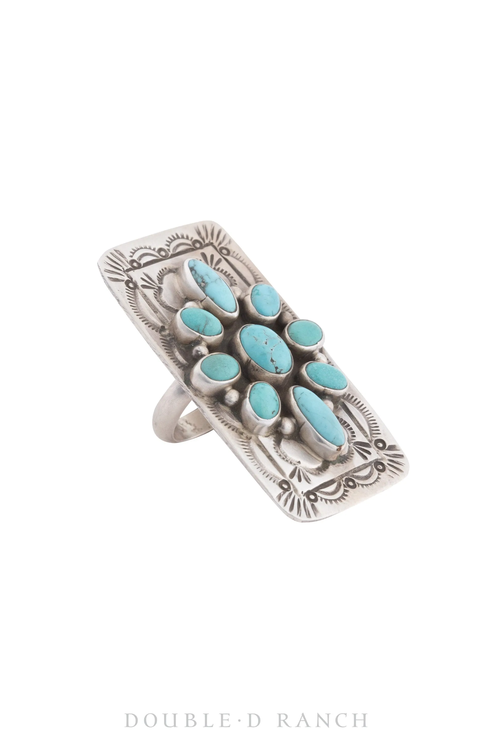 Navajo silversmith Geraldine James has crafted this contemporary shield ring and we're in love. The long sterling silver design features unique engravings alongside a cluster of turquoise stones. A modern classic, grab it while you still can.- artist: Geraldine James