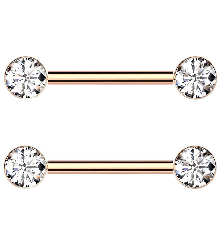 Rose gold, threadless titanium nipple barbells with double, bezel-set, clear cz gem endsthat are about 5mm in size and have a rounded, convex back.Madewith rose gold pvd on ASTM F-136 Implant grade titanium andavailable in size 14G (1.6mm) witha 9/16" (14mm) length. Sold in pairs (2pcs).For healed piercings.