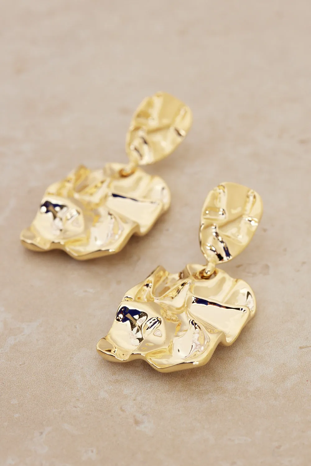 Elevate your look with the Savannah gold-tone textured drop earrings. Featuring an eye-catching, crinkled design, these statement earrings bring a touch of glamour to any outfit. Lightweight yet bold, they are perfect for both daytime chic and evening elegance, adding a sophisticated edge to your jewellery collection.