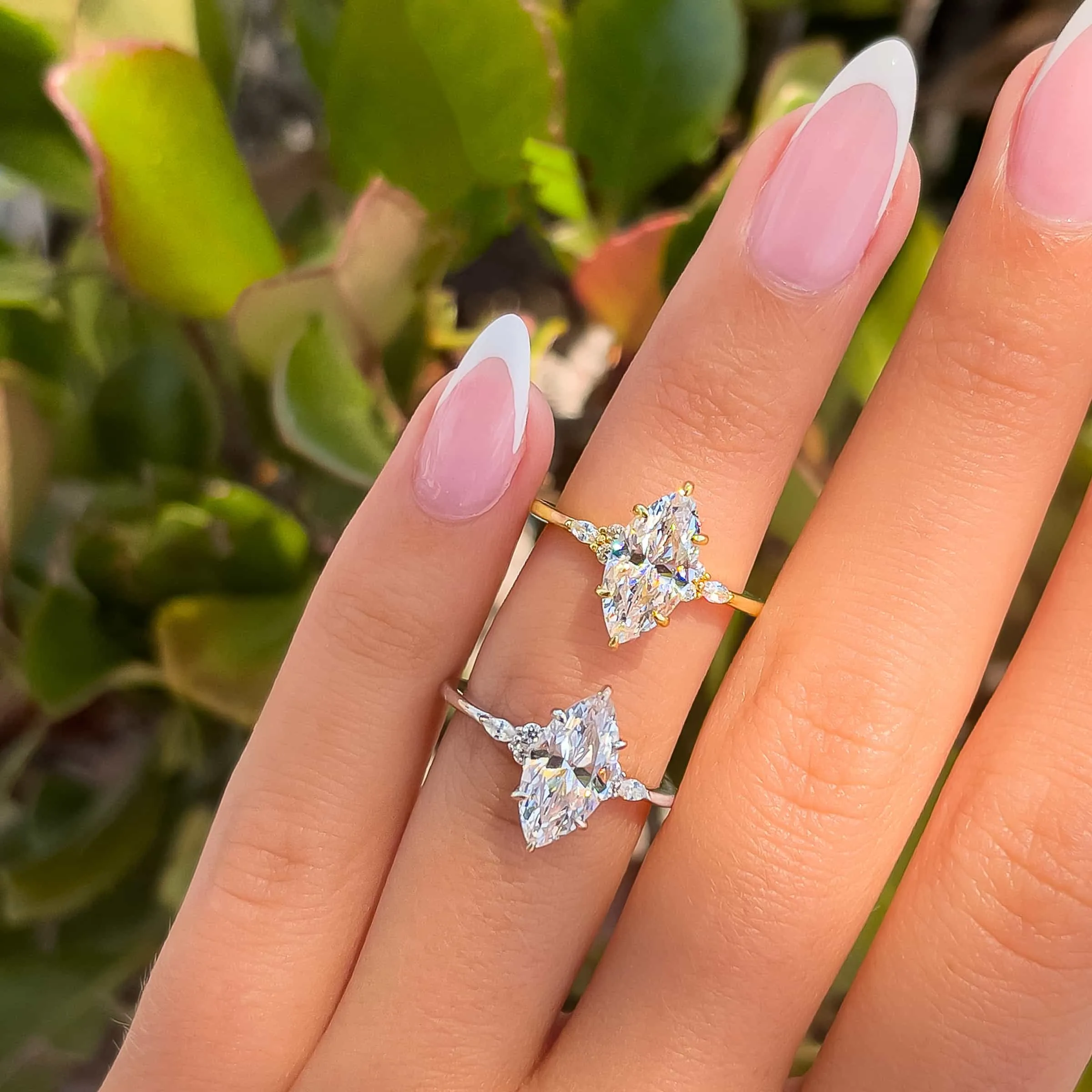 Now this, is what dreams are made of. With a 2.5 carat marquise cut center stone, delicate gemstone detailing, and a refined gold band, The Iris boho engagement ring is everything you've been looking for. Pair it with bands like The Zoey or The Desire for a sparkle you won't be able to resist! Also available in silver.