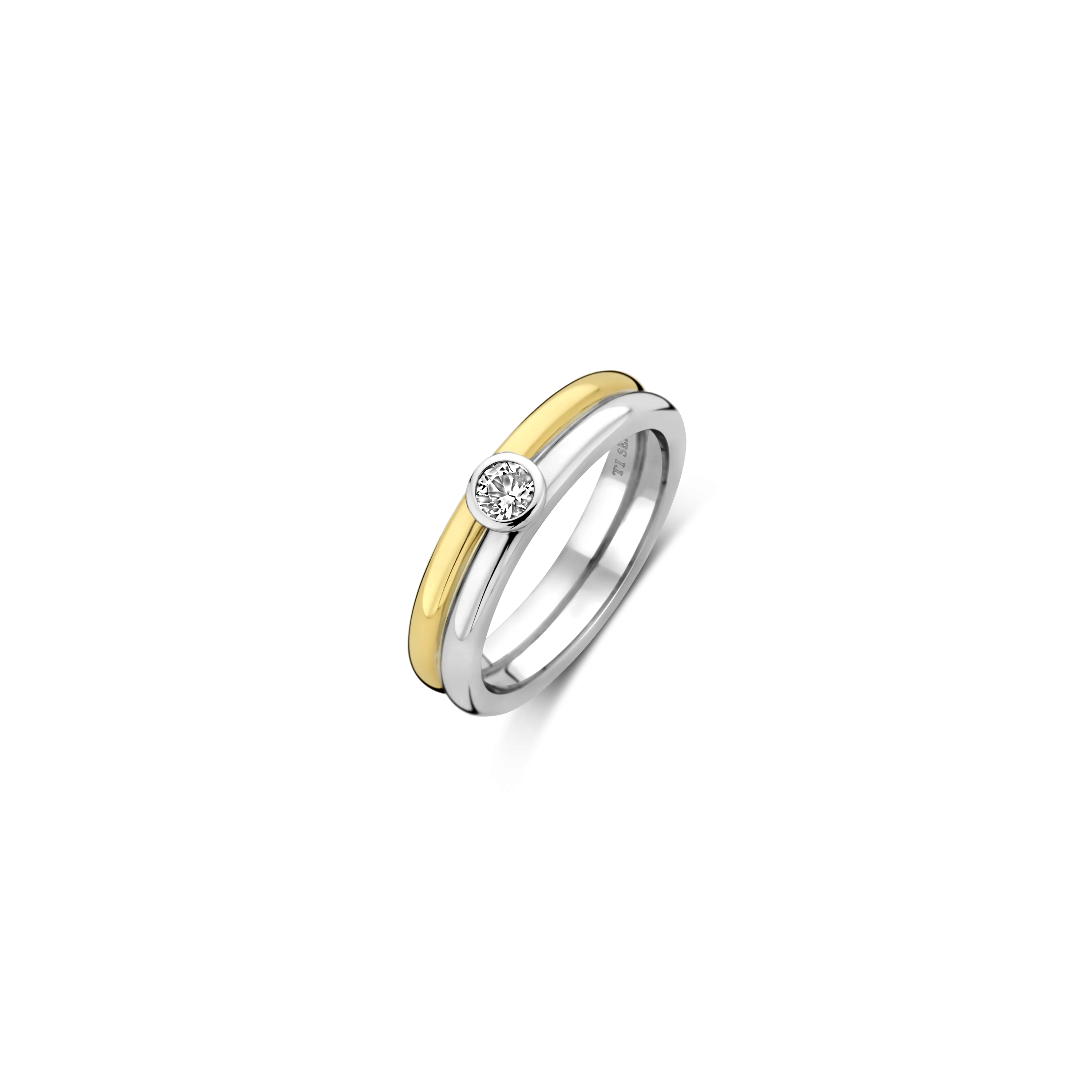 Indulge in timeless elegance with this TI SENTO gold-plated silver Ring 12345ZY. Crafted from 925 sterling silver, the ring features two refined bands, one plated with platinum for a cool, contemporary finish, and the other plated in radiant yellow gold for a touch of warmth and luxury. At its centre, a dazzling white cubic zirconia stone adds a touch of brilliance. This ring is a perfect fusion of classic and modern design, offering a sophisticated and versatile accessory. The contrast between silver and yellow gold creates a captivating interplay of light and texture. Elevate your everyday look with this timeless piece. Wear it alone for a minimalist statement or stack it with other TI SENTO rings for a personalised touch. Crafted with care for sensitive skin, this nickel-free and hypoallergenic ring ensures lasting comfort and quality.