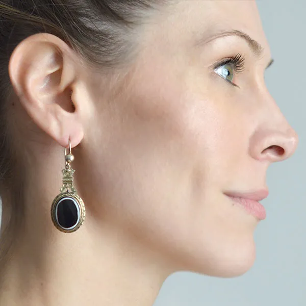 A stunning pair of banded agate earrings from the Victorian (ca1880) era! Made of soft 12kt yellow gold, each earrings features a large banded agate stone set within a closed back bezel setting. The stones are set within a beautifully ornate twisted wirework and etched frame and hang from "X" shaped links which carry a complimentary design. The banded agate stones are polished smooth and have a deep brownish black color with a white and grey band encircling the outside of the stone. At the top of each earring is a single gold bead surmount which attaches to a simple wire. When worn, the earrings look fabulous and make a lovely statement! They would make a perfect addition to any collection.